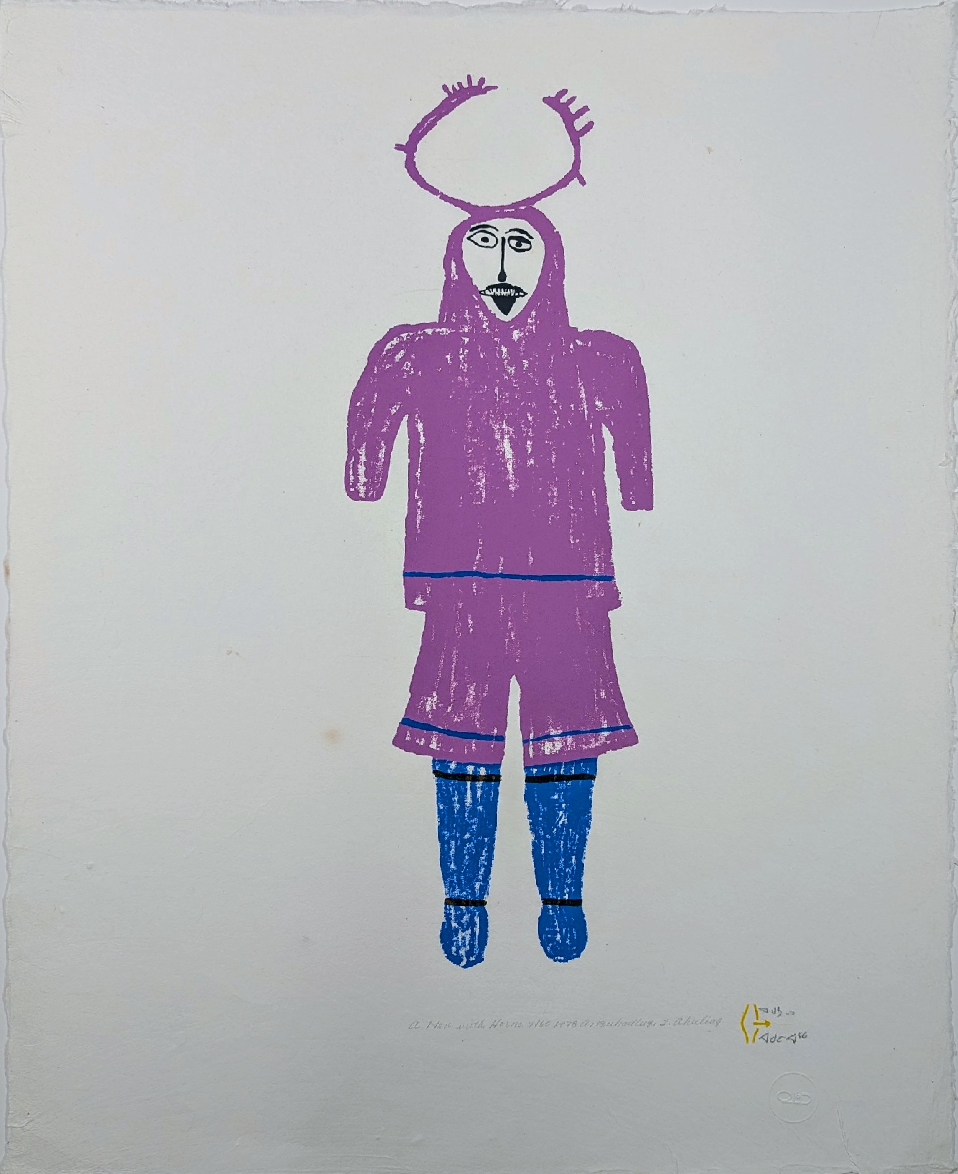 Luke Anguhadluq was a highly respected Inuit artist from Baker Lake (Qamani’tuaq), Nunavut, and a foundational figure in the development of Inuit drawing and printmaking in the central Arctic. Largely self-taught and drawing directly from lived experience, Anguhadluq developed a distinctive visual language marked by flattened space, direct narrative, and an unembellished clarity of line. His images of life on the land, hunting practices, and traditional knowledge are not stylized for effect, but recorded with authority and precision. A key contributor to the Baker Lake print program, his work is sought after by knowledgeable collectors and is held in major museum collections as a cornerstone of Inuit graphic art.