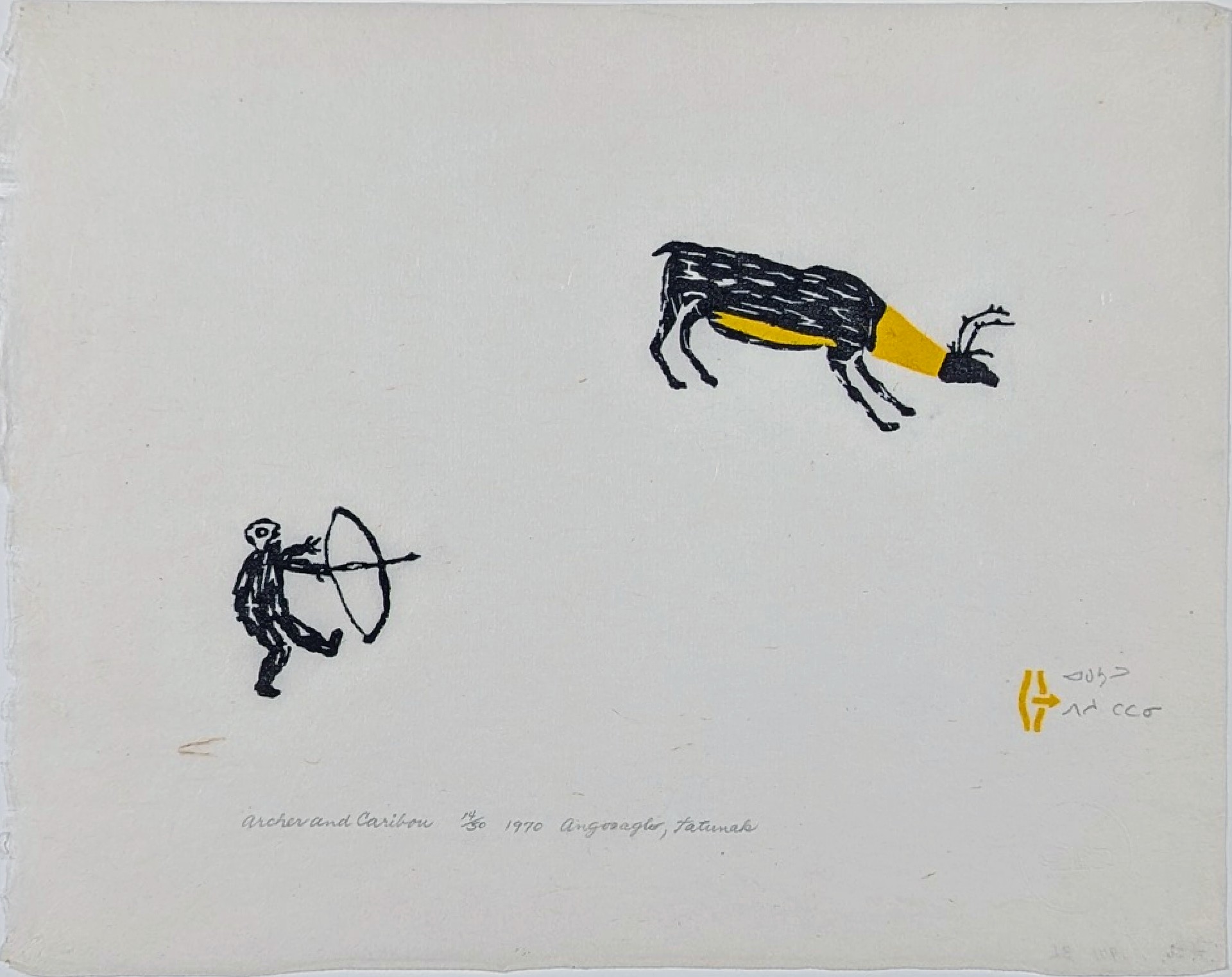 Luke Anguhadluq (1895–1982) was a highly respected Inuit artist from Baker Lake (Qamani’tuaq), Nunavut, and a foundational figure in the development of Inuit drawing and printmaking in the central Arctic. Largely self-taught and drawing directly from lived experience, Anguhadluq developed a distinctive visual language marked by flattened space, direct narrative, and an unembellished clarity of line. His images of life on the land, hunting practices, and traditional knowledge are not stylized for effect, but recorded with authority and precision. A key contributor to the Baker Lake print program, his work is sought after by knowledgeable collectors and is held in major museum collections as a cornerstone of Inuit graphic art.