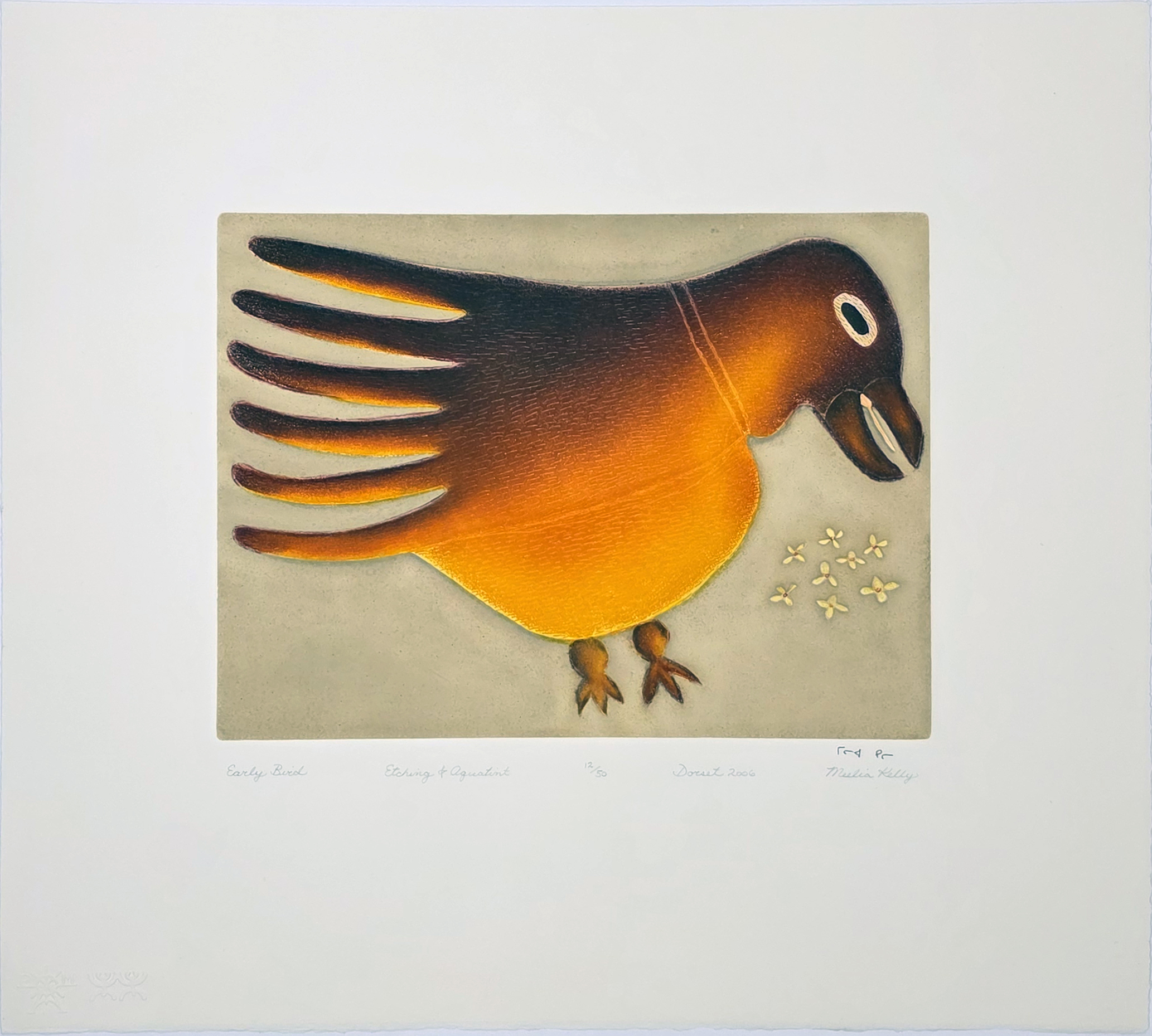 Meelia Kelly is an Inuit artist from Kinngait (Cape Dorset), Nunavut, known for her colourful and often whimsical drawings and prints depicting Arctic animals and scenes from northern life. Working within the Kinngait graphic tradition, Kelly creates lively compositions that emphasize movement, pattern, and expressive line, frequently portraying birds and animals with a sense of playfulness and character. Her work balances observation with imaginative interpretation, resulting in images that feel both familiar and animated. Kelly has contributed to the annual Cape Dorset print collections over several decades, and her work is collected for its vibrant colour, engaging imagery, and distinctive personality within the Kinngait tradition.