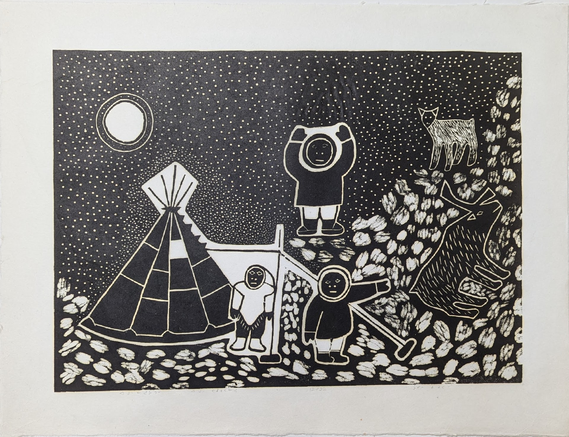 Artist: Janet Ikuutaq Region: Baker Lake Size: 18.9” x 24.8” (48 x 63 cm) Medium: Relief Woodcut Year: 1997 Edition: Condition: Excellent