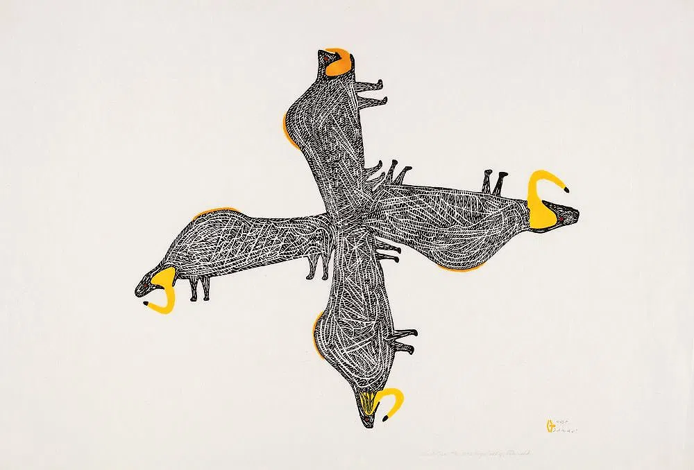 Luke Anguhadluq was a highly respected Inuit artist from Baker Lake (Qamani’tuaq), Nunavut, and a foundational figure in the development of Inuit drawing and printmaking in the central Arctic. Largely self-taught and drawing directly from lived experience, Anguhadluq developed a distinctive visual language marked by flattened space, direct narrative, and an unembellished clarity of line. His images of life on the land, hunting practices, and traditional knowledge are not stylized for effect, but recorded with authority and precision. A key contributor to the Baker Lake print program, his work is sought after by knowledgeable collectors and is held in major museum collections as a cornerstone of Inuit graphic art.