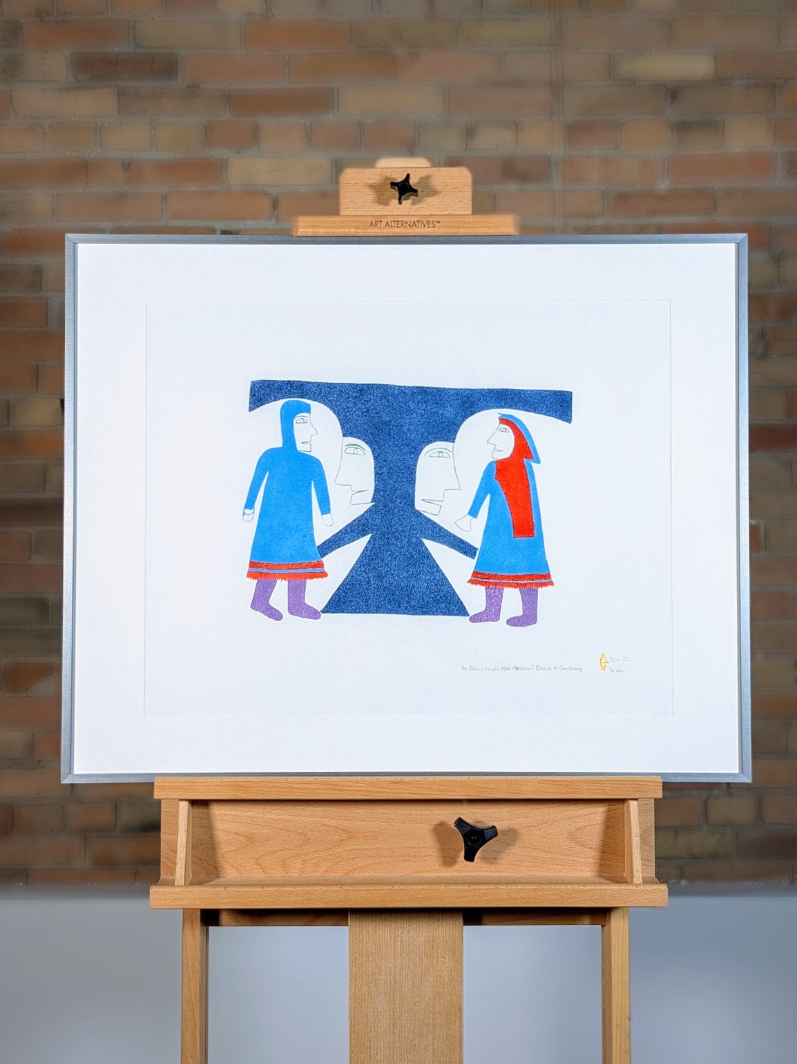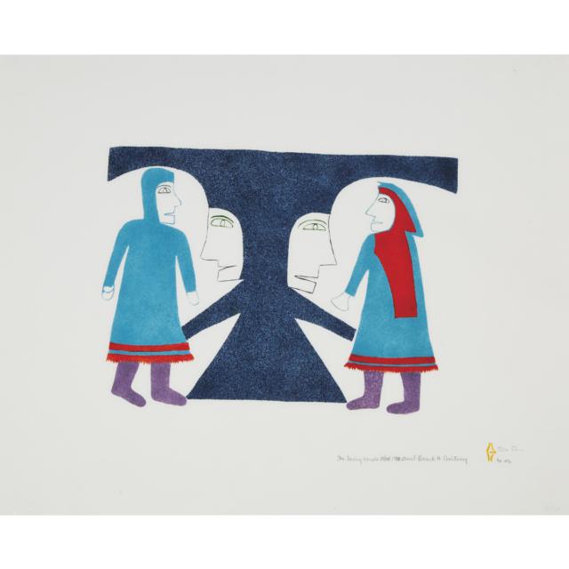 Her imagery often reflects memories of traditional Inuit life, particularly the importance of family, community, and clothing traditions. Figures—frequently women in elaborately patterned parkas—are arranged in rhythmic groupings that emphasize repetition, balance, and decorative structure. Pattern plays a central role in her work, functioning not only as surface design but as a key element of the composition itself.