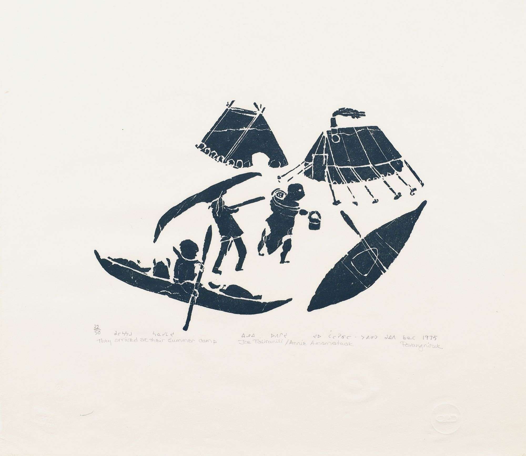 Joe Talirunili was an Inuit artist from Puvirnituq (Povungnituk), Nunavik, Québec, best known for his expressive sculptures and prints that recount a remarkable episode from his early life. As a young man, Talirunili survived a dramatic journey across Hudson Bay on an improvised raft with several companions after their umiak was lost. This experience became the subject of many of his artworks, in which figures, animals, and boats are arranged in lively, narrative compositions. Working primarily in stone sculpture as well as drawing and printmaking, Talirunili developed a highly distinctive style that combines storytelling, humor, and bold form. Today his work is widely collected and recognized as an important contribution to the history of Inuit art.